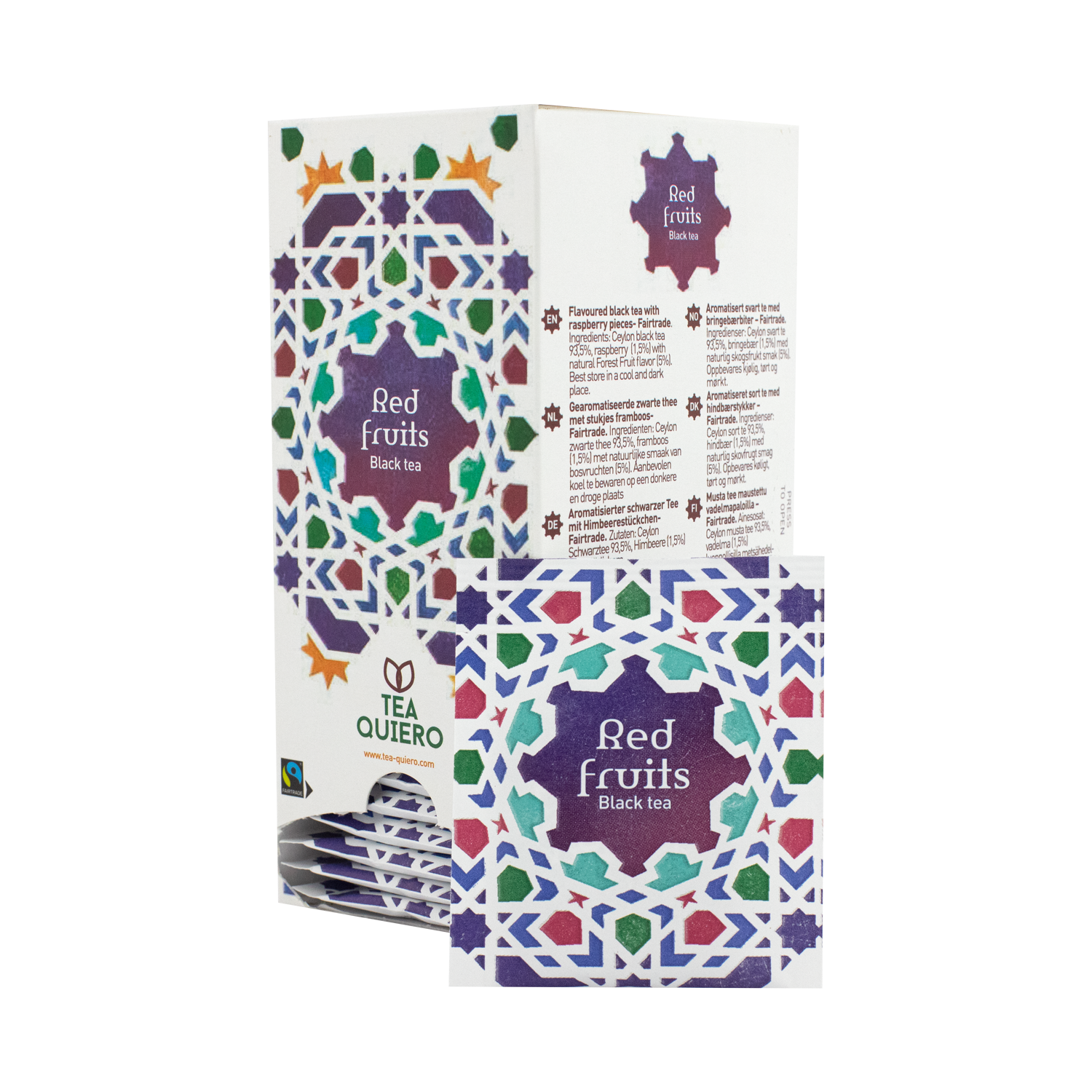 Black teas blend with raspberry pieces and berries. Intense.